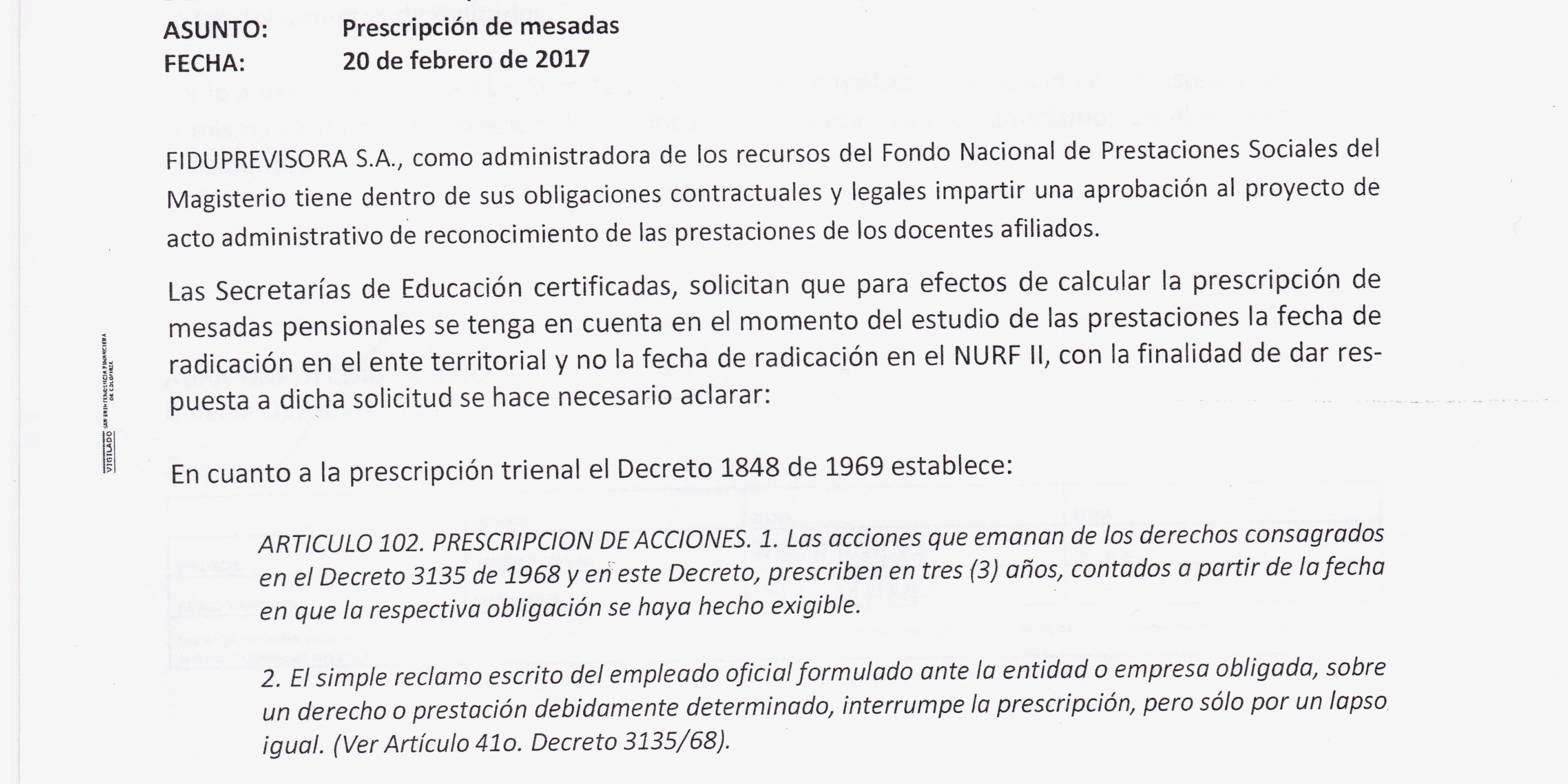 FIDUPREVISORA S.A. CIRCULARES Nro. 012, 013, 014 Y 015 DE FEBRERO DE 2017 -Prestaciones sociales