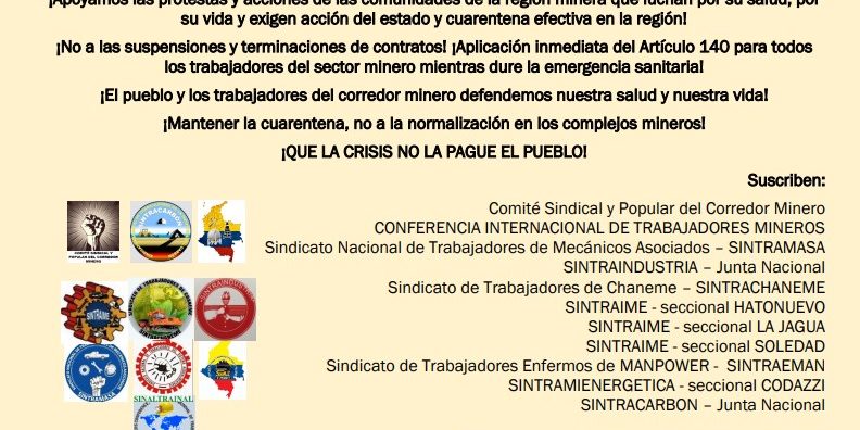 PRONUNCIAMIENTOS DEL SECTOR MINERO-ENERGÉTICO: ¡EL PUEBLO Y LOS TRABAJADORES DEL CORREDOR MINERO DEFENDEMOS NUESTRA SALUD Y NUESTRA VIDA!