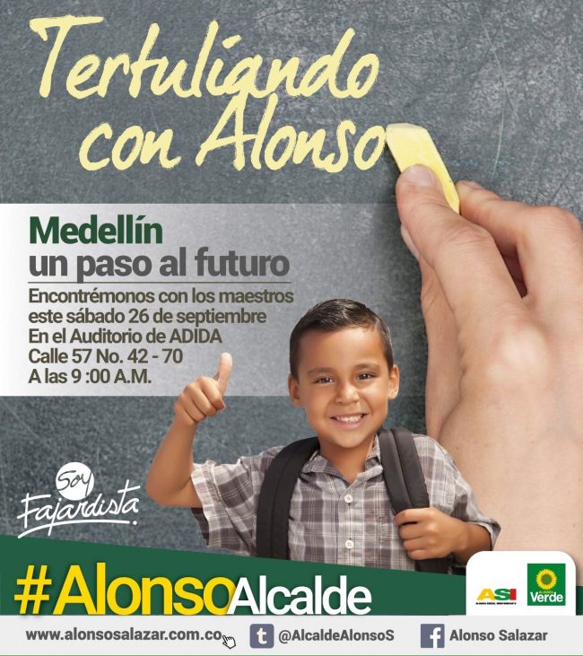 MAESTROS Y MAESTRAS: TERTULIANDO CON EL CANDIDATO A LA ALCALDÍA DE MEDELLÍN ALONSO SALAZAR -SÁBADO 26 DE SEPTIEMBRE DE 2015. HORA: 9: 00 AM EN ADIDA PUNTADAS PROGRAMÁTICAS EN EDUCACIÓN: PROGRAMA DE GOBIERNO DE ALONSO SALAZAR: POR ESO, #YOvotoporAlonso Y #YOmecomprometo: