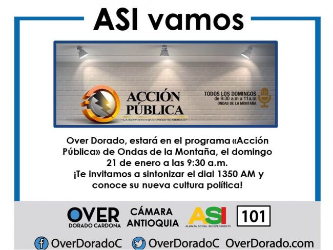 Over Dorado Cardona, invita a sintonizar la emisora Ondas de la Montaña, este domingo 21 de enero a las 9:30 a.m. para que conozca y sea participe de sus propuestas políticas y sociales a la Cámara de Representantes.