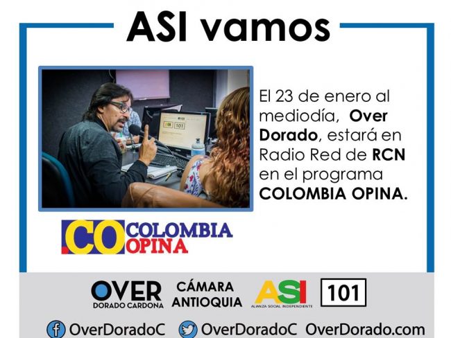 El 23 de enero a las 12 del mediodía, el candidato Over Dorado Cardona, estará en el programa Colombia Opina de la emisora Radio Red de RCN, donde compartirá con sus oyentes, sus propuestas políticas y sociales, hacía la Cámara de Representantes.