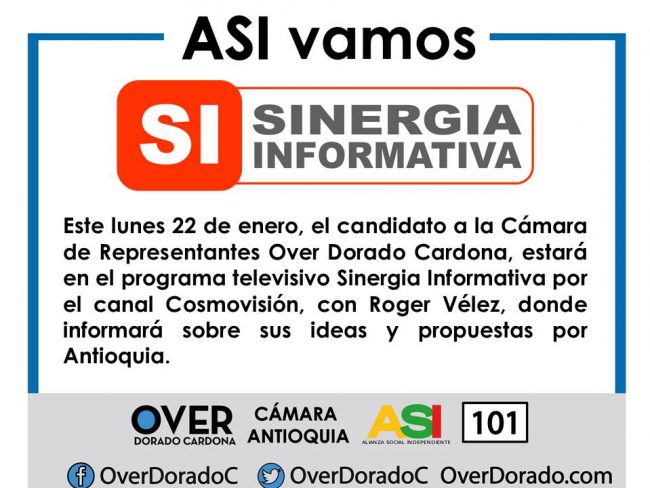 Este lunes 22 de enero a las 12 del mediodía, el candidato a la Cámara de Representantes Over Dorado Cardona, estará en el programa televisivo Sinergia Informativa por el canal Cosmovisión, con Roger Vélez.